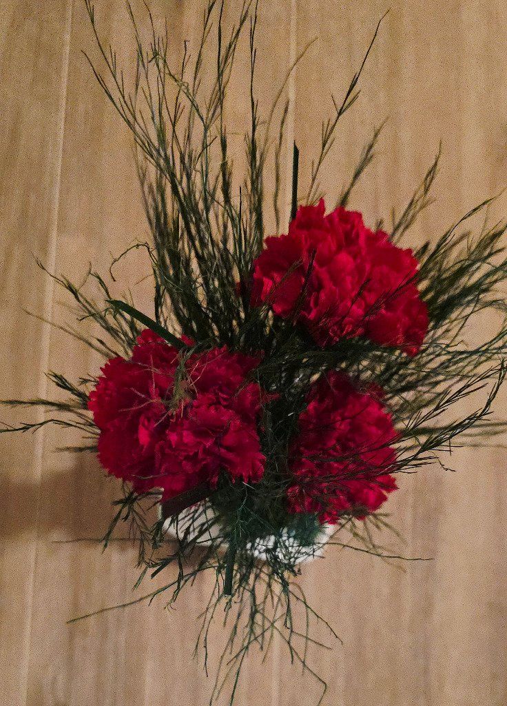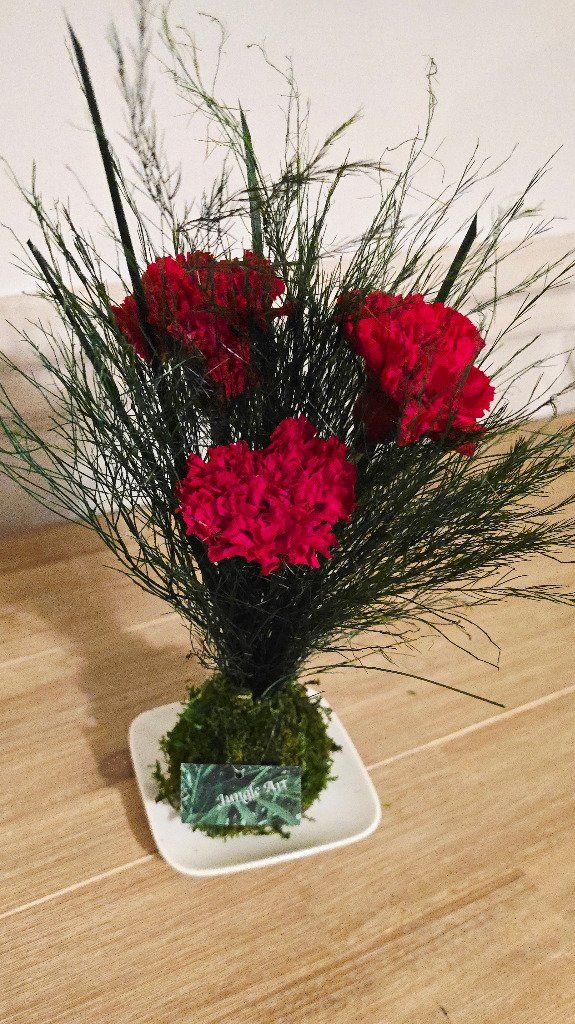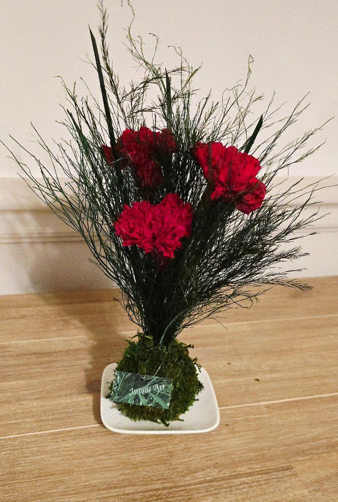 Trio d'oeillets rouges, beargrass , Tree Fern