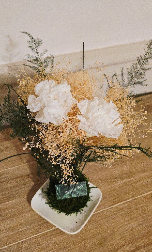 Trio d'oeillets blancs, mini Gypsophile, Aspargus plumus